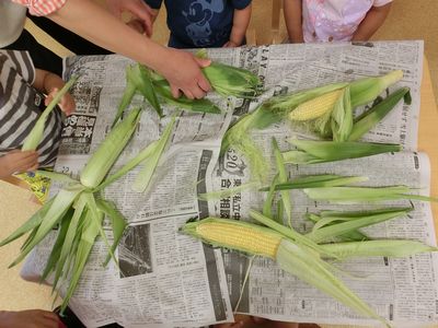 トウモロコシの皮むき、キャベツちぎり、にんじん洗い、、、 調理の先生のお手伝いをします。もちろん、給食やおやつでいただきます。 茹でトウモロコシは子どもたちに大人気です!!!!!